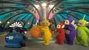 The Teletubbies get fun creeping round the control panel and under the arch before watching some children making gymnastics. Laa-Laa plays catch with the ball indoors but it starts bouncing around the house. The other Teletubbies help Laa-Laa try and catch the ball, but Noo-Noo catches the ball first and tidies it up. Oh, no! Naughty Noo-Noo! The Teletubbies chase Noo-Noo until he gives Laa-Laa her ball back. The Teletubbies give Noo-Noo a Big Hug. Then the Magic Windmill prepares stopping spinning, they say "Uh-oh!", and the Magic Windmill stops spinning and it is time for Tubby Bye-Bye.