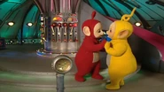 - In the close up shot of Tinky Winky and Dipsy, what appears to be a prop with the design pattern of the windows inside the Tubbytronic Superdome can be seen in front of the Tubby Custard Machine.