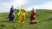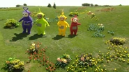 A Voice Trumpet rises and makes duck sounds, which Laa-Laa finds very funny. The Magic Windmill spins, She runs off as the Voice Trumpet lowers. and the Teletubbies watch Sarah and Fraser feeding the ducks. Po learns a new trick. When she makes some Tubby Toast, she catches it in her hands. She makes more Tubby Toast, but it bounces around the house, and Noo-Noo tidies it up. She chases him around the house before The Magic Windmill spins. She Runs outside The whole Teletubbyland is filled with water,all they watch The 3 Ships Sail Through Teletubbyland Then The 3 Ships disappear at the end of the event and the water disappears, with a plug-hole sound at the end then they make The Tip Toe Dance before Tubby Bye-Bye.