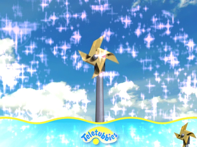 Video Game 2: Seen in Favourite Games, the Windmill is seen in a computer-animated form with the entire stand seen, playing one of the TV Receiver sounds, and the sparkles from the Teletubby Screens animation are seen in white (in contrast to their usual pink colour.). There is no ground shown in this animation. Like in Haymaking, Sophie Art - Circus, Stop and Go, and "Play with the Teletubbies", the windmill spins slowly.