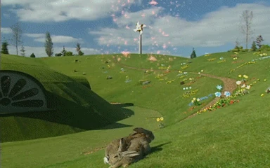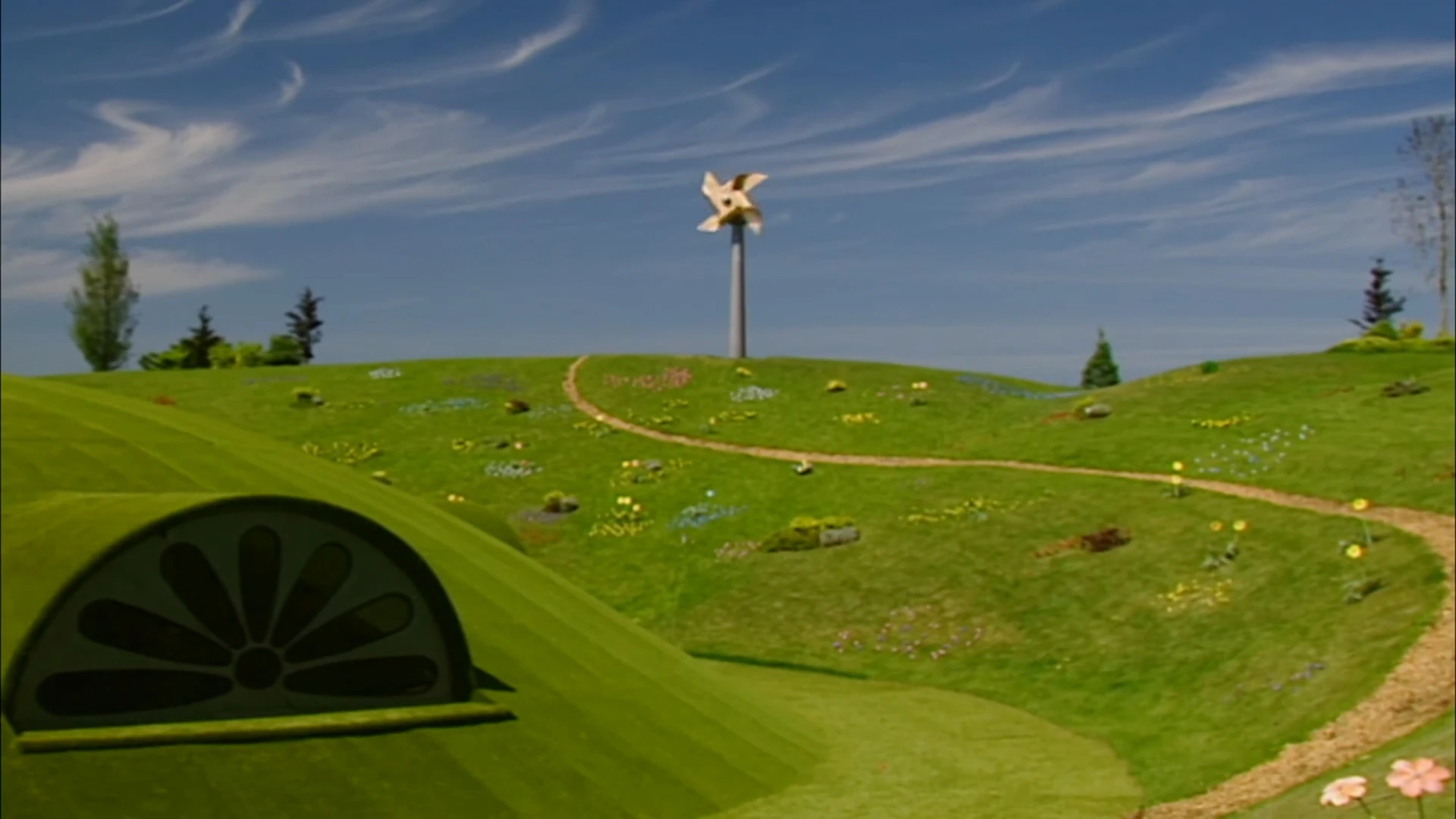 Bird's Eye View: One of the rarer animations. The Windmill is filmed spinning from the bottom of the hill, from a left-angle view. Two rabbits can be seen in front of the camera view. Part of the Superdome is also seen. The sky is dark blue with several clouds. This animation is notably used in Here Come the Teletubbies (US Version Only) and Again, Again! This animation was first used in Making Flowers. This animation was also used in the US Version of Numbers - 1, but this time it cuts to the Windmill spinning for the Numbers - 1 TV Event without showing the Teletubbies coming outside to see the Windmill spinning. A version of this footage has the Windmill spin normally and lack of sparkles and is an opening shot, known as Home Hill 2.