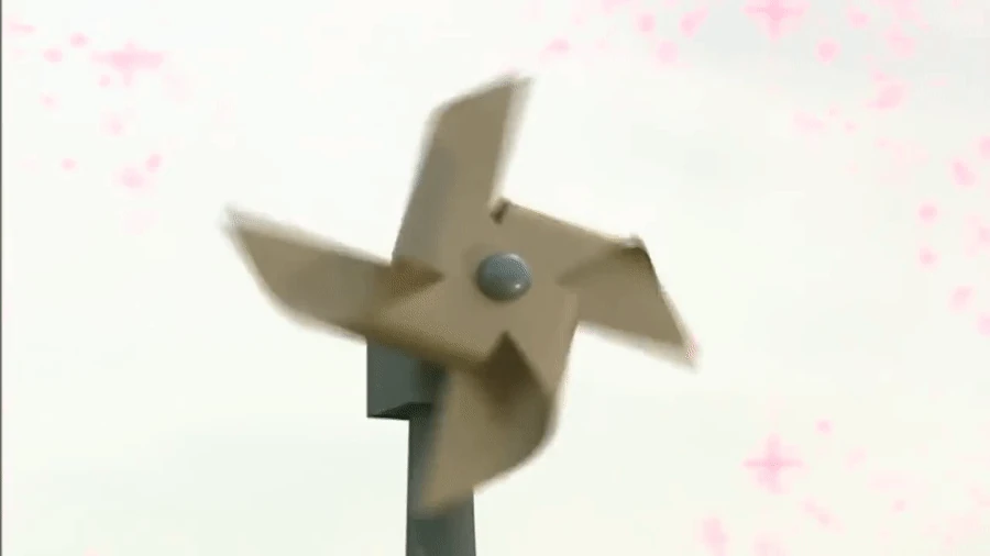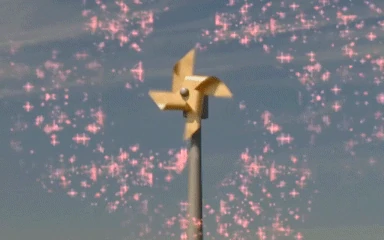 Usually, The Magic Windmill is seen spinning slowly in the background in a counterclockwise (or anticlockwise) direction. Whenever the wind picks up, The Magic Windmill will begin spinning faster, with magical pink sparkles appearing and surrounding The Magic Windmill. The sound effect of the spinning Windmill is a very strange and metallic blow sound, the source sample used to create it is called "SWAN DIVE" from Spectrasonic's "Distorted Reality 1" Sample library.