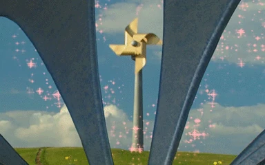 Stop Spinning: The Windmill is seen up close at a left angle view. The ground is not seen, but the sky is dark blue with thin clouds. The Windmill will initially be seen spinning fast and will begin slowing down. The pink sparkles begin to fade away as well. The Windmill's speed decreases until it eventually stops spinning and freezes in place. Following this animation is the Tubby Bye-Bye sequence but in later episodes, this animation happened in the middle of an episode. This animation is also seen spinning at top speed during the TV Receiver sequence spinning with the sparkles from the Start Spinning animation. It can sometimes be seen when one of the Teletubbies does any activity they are doing. For Example, when Po was scaring off the spider during Little Miss Muffet, and the Teletubbies with the Voice Trumpet and with the Number 4. In Urban Birds, this animation had the Magical Event tune playing.