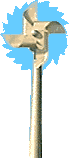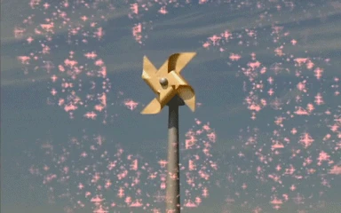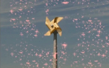 The Magic Windmill resembles a large pinwheel, though it is still considered a windmill. It has a gold propeller with a metal turbine stand. A metal box that holds the propeller from behind is also visible. When it spins fast, pink sparkles surround it.