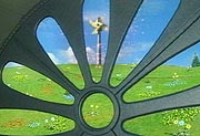 One of the windows of the Teletubbies' House with the Magic Windmill outside.